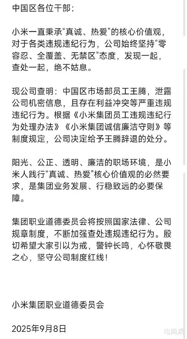 王腾是小米原中国区市场部总经理、REDMI品牌总经理。前段时间,他被曝出已被小米辞退,原因是“泄露公司机密信息,且存在利益冲突等严重违规违纪行为。根据《小米集团员工违规违纪行为处理办法》《小米集团诚信廉洁守则》等制度规定,公司决定给予王腾辞退的处分。”