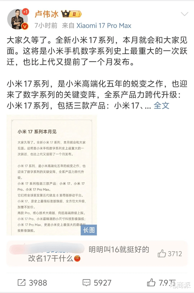 iPhone 17系列发布后不久,小米集团总裁卢伟冰在微博正式官宣:小米17系列将在本月发布,引起轩然大波。因为网传小米今年要出的是16系列,但如今小米却选择跳过16,直接出17,让众多期待小米新机的消费者和科技爱好者深感意外。