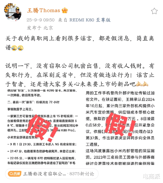 网上流传的信息称,王腾从2024年10月起,多次向三家外部机构提供小米汽车(SU7)定价策略、供应链成本等核心商业机密,累计收受咨询费187万元。对此,王腾表示这些都是假消息,他承认自己存在失职违规的行为,但并没有违法。
