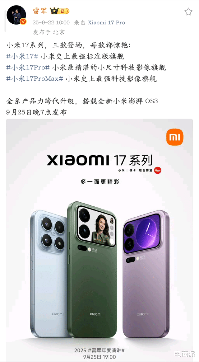 之后,雷军持续在微博发文,为小米17系列预热。他表示,“全系产品力跨代升级,搭载全新小米澎湃OS3,9月25日晚7点发布。”“质感大升级,惊艳蜕变。”