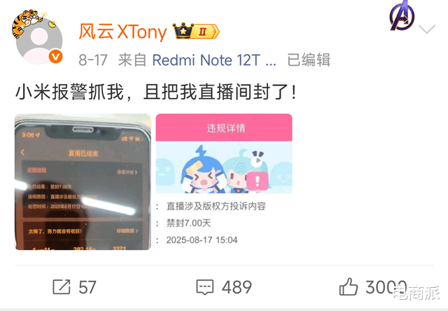 8月底,网红作家“风云XTony”突然发微博称,自己去提小米SU7 Ultra新车,但“小米报警抓我,且把我直播间封了!”