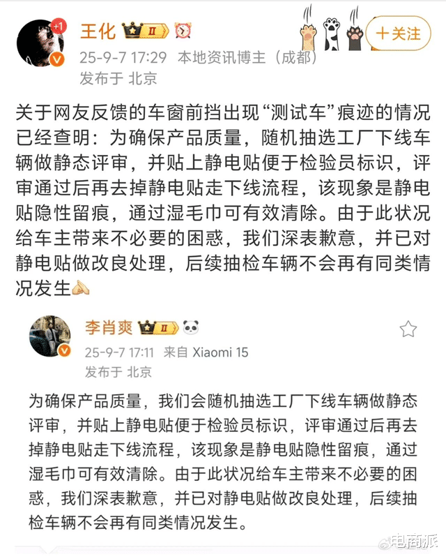 该事件迅速在网上发酵,小米汽车副总裁李肖爽和公关部总经理王化先后在微博上发声回应此事,称“为确保产品质量,随机抽选工厂下线车辆做静态评审,并贴上静电贴便于检验员标识,评审通过后再去掉静电贴走下线流程,该现象是静电贴隐性留痕,通过湿毛巾可有效清除。”