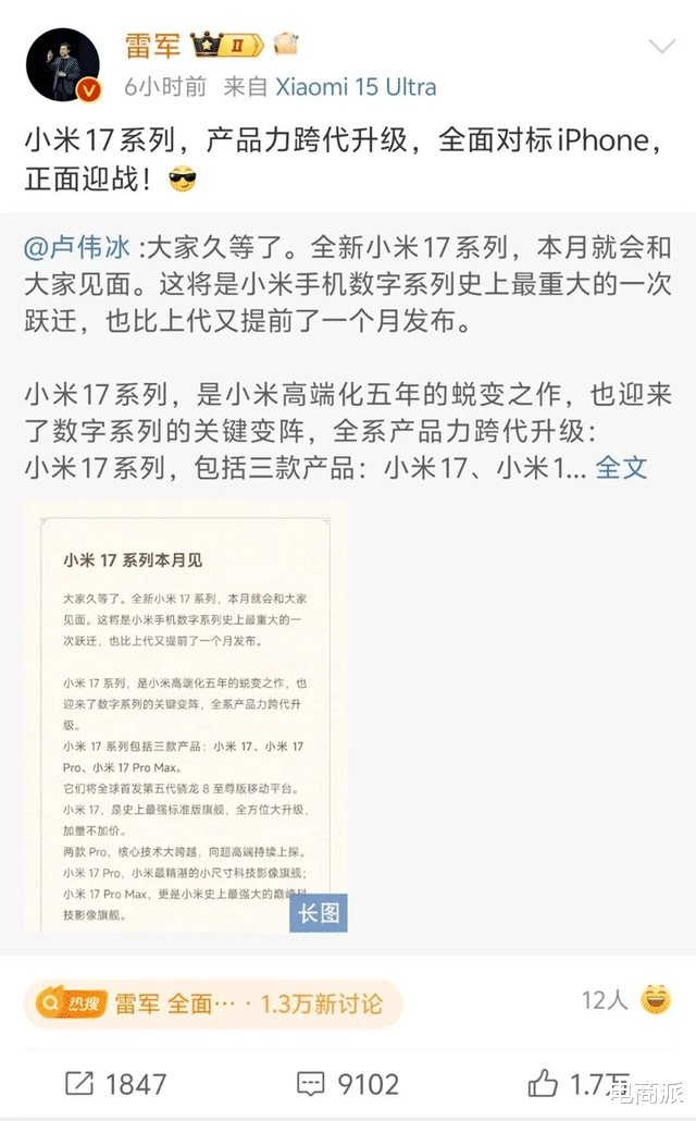 很快,雷军出来解释此事,称:“小米17系列产品力跨代升级,全面对标iPhone,正面迎战!”